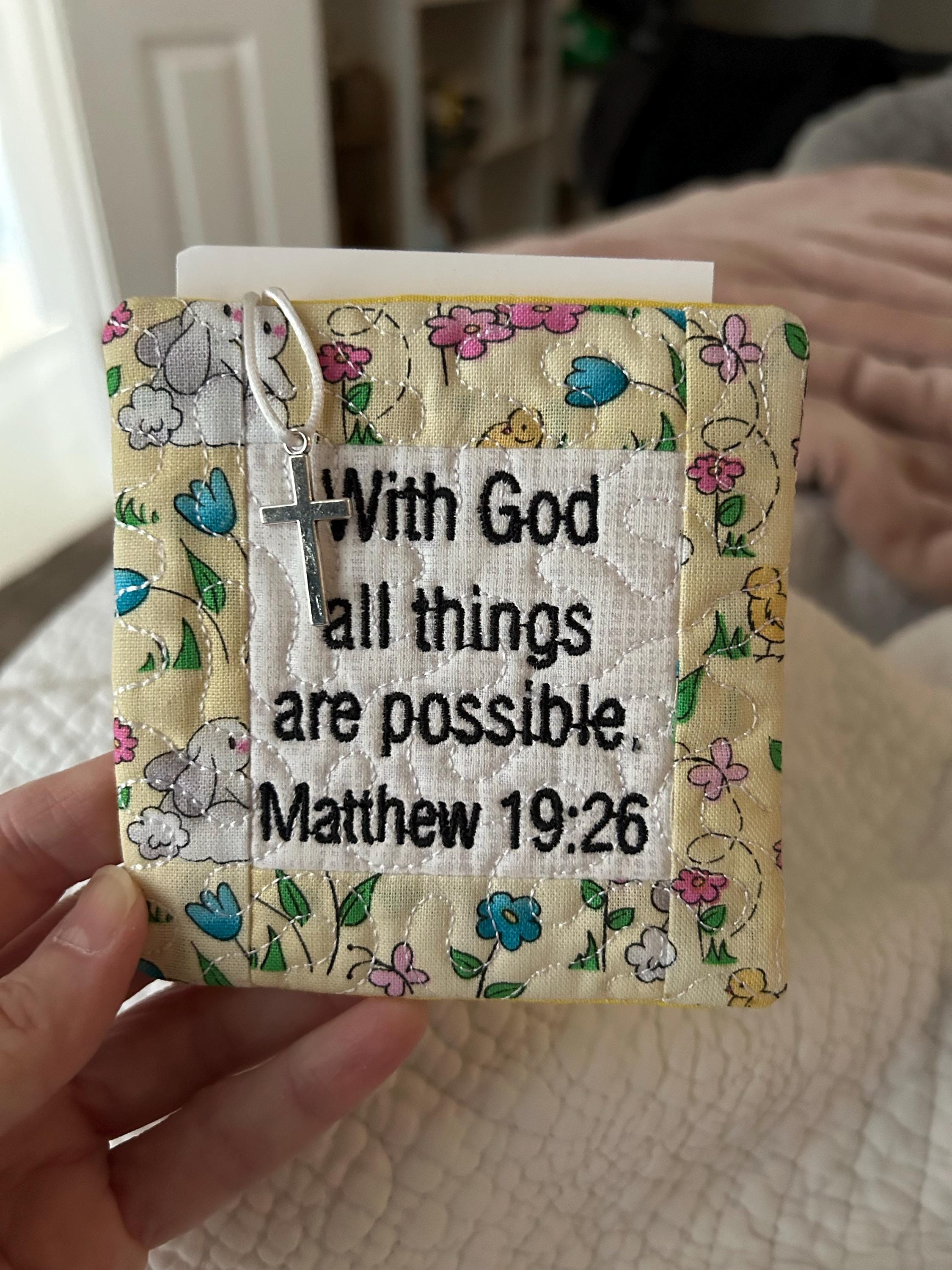 This pocket prayer quilt is has the scripture, "With God all things are possible" Matthew 19:26 elegantly embroidered on it. Each quilt has with an original copyrighted poem I wrote enclosed explaining what it is called "I'm A Pocket Prayer Quilt" printed on beautiful card stock. The card is the same size as most prayer cards, memorial cards, etc. which all fit in the back pocket. The quilt is approximately 4 inches square which is the perfect size to fit in your pocket, wallet, purse, car, at your office or home - ready to use as a reminder that God is bigger than your troubles. It also has a beautiful silver high quality zinc alloy (lead & nickel free) cross hanging from a white satin cord loop that is sewn securely into the top seam of the quilt. The set is packaged together and sealed in a cellophane envelope ready to be gifted. Pocket Prayer Quilts are the perfect way to bring comfort, peace, and share your love for the Lord. These mini quilts make the perfect gift to let someone know how important they are and that they are never alone.
